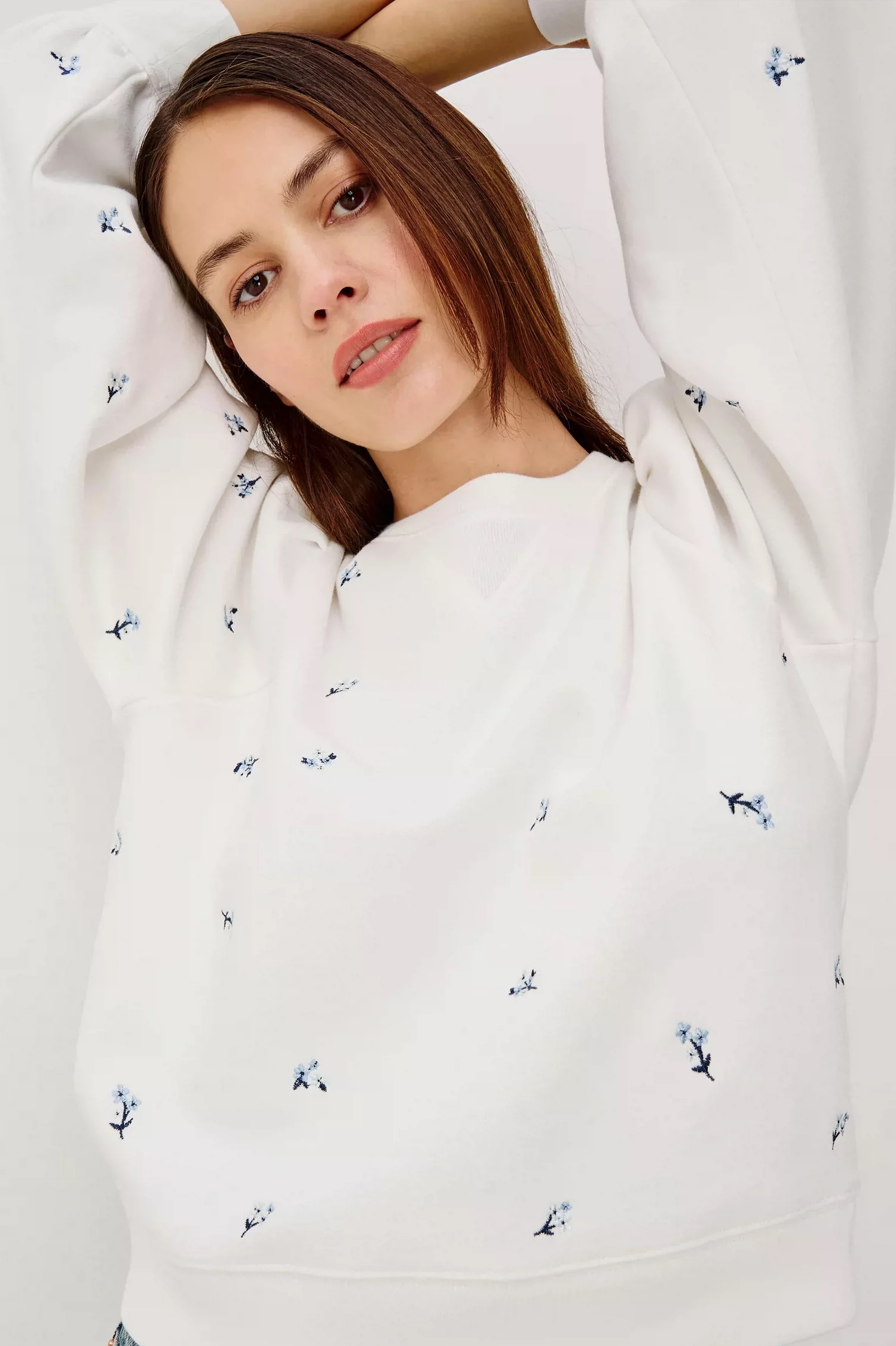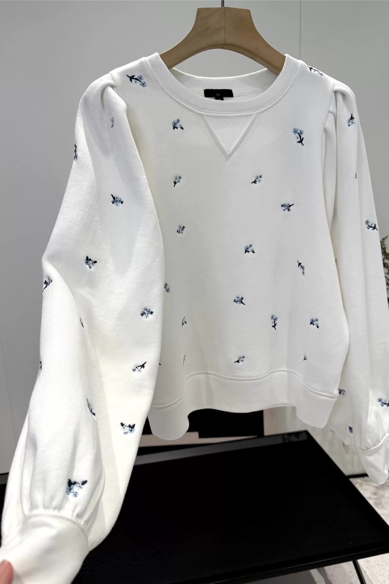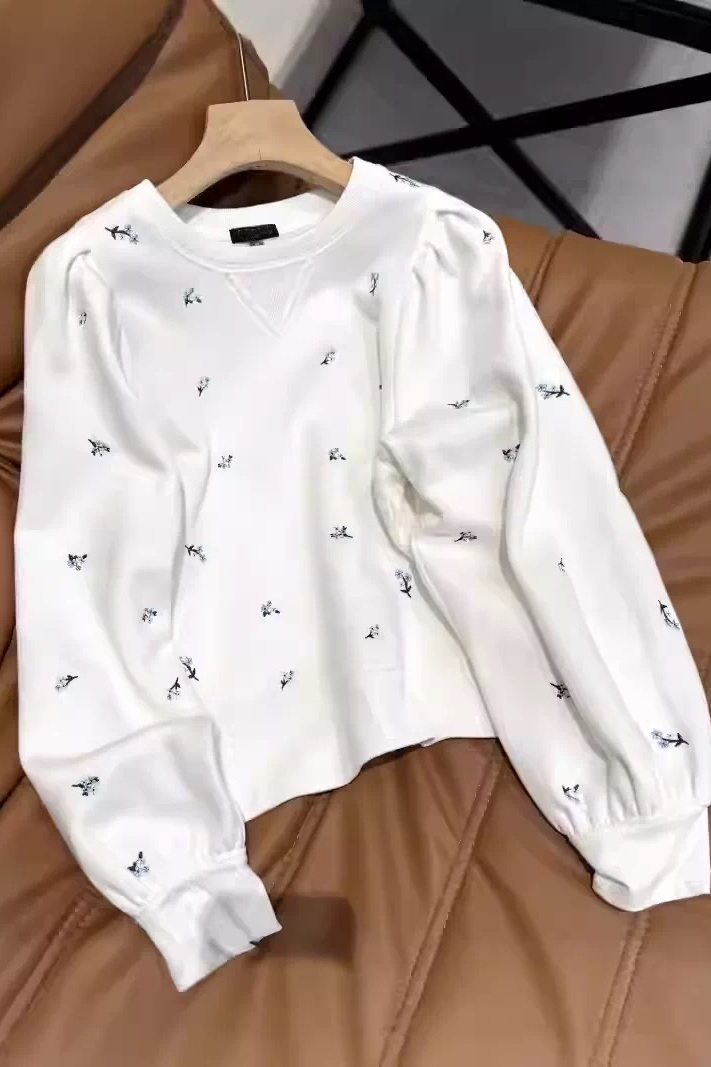 Feminine ease for every day, the Tiffany sweatshirt features floral embroidery in soft French terry, with long puff sleeves and a relaxed, boxy fit.