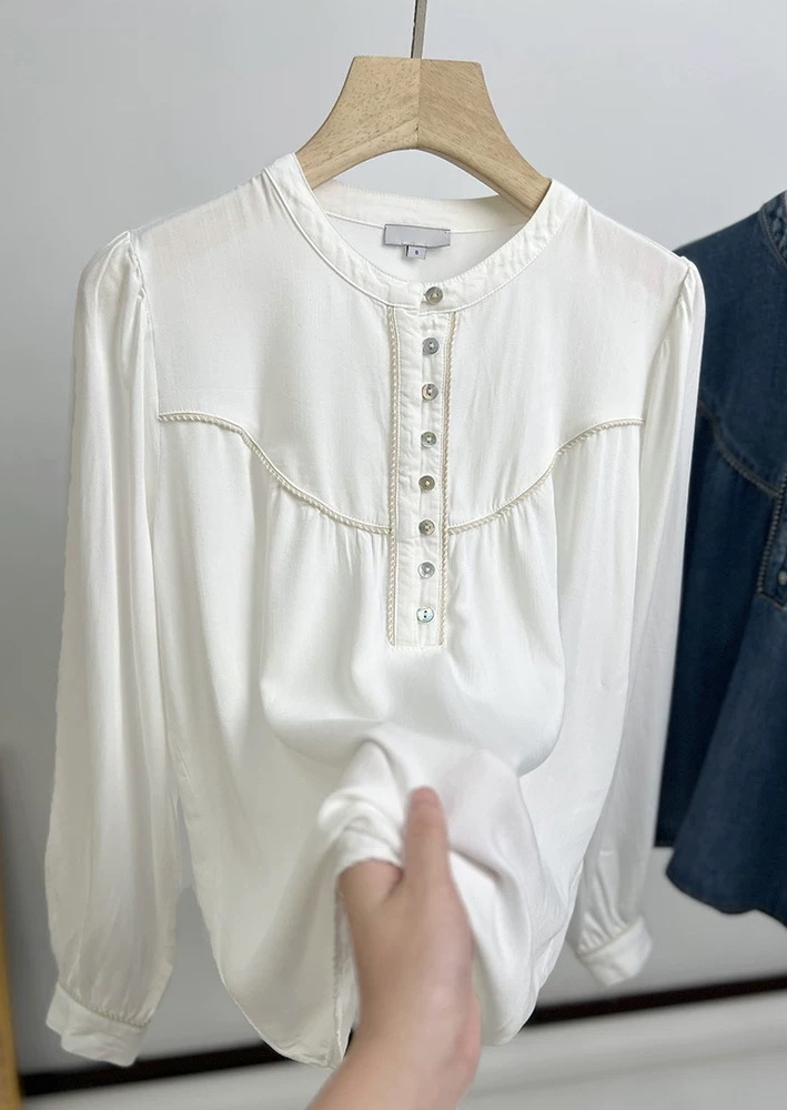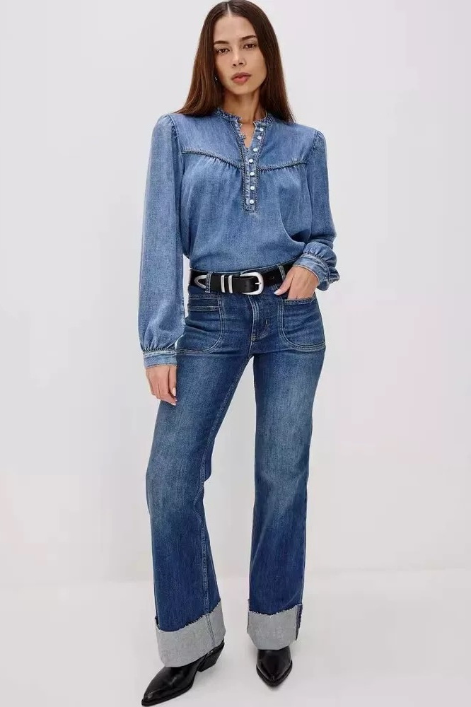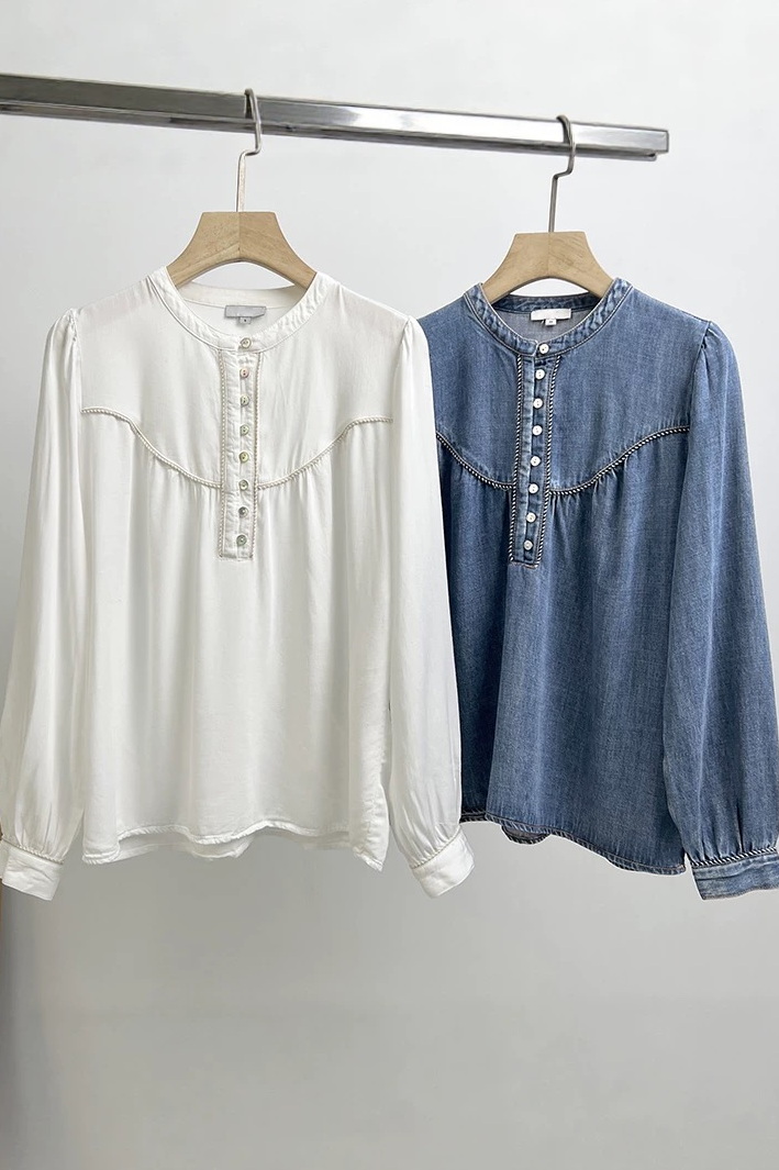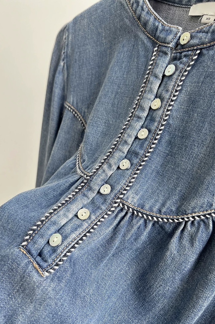 The Sunna is a timeless denim shirt with a lived-in wash. It features a half front placket with shell buttons, two-toned twist piping, a high neckline, and long puff sleeves with fitted cuffs.